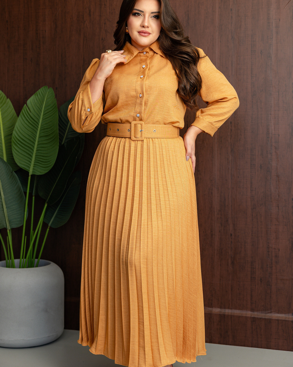 Esse vestido chemise com saia plissada é perfeito para quem ama um look clássico, moderno e cheio de charme.